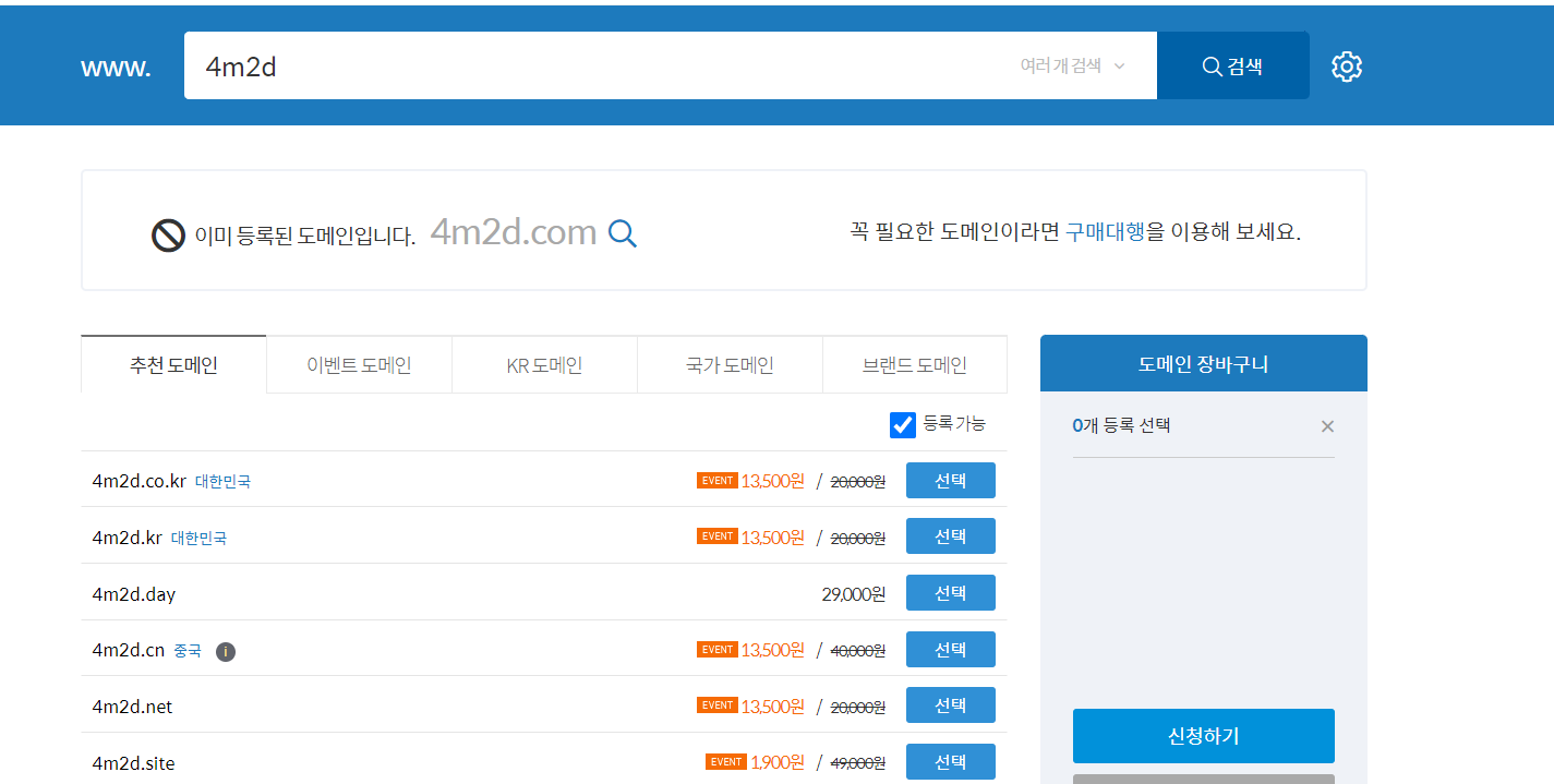 해당 홈페이지에서 도메인 검색에 들어가면 다양한 도메인들이 존재한다.