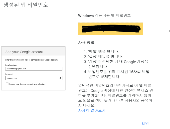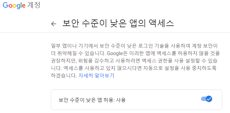구글에서 "보안수준이 낮은 앱의 액세스"에 대해 기본적으로 막아두고 있었기 때문이었다.