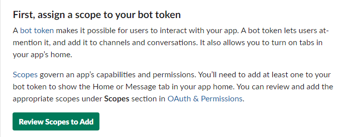 Slack에서는 이러한 기능의 범위를 설정해주는 작업을 먼저 진행하라고 친절히 안내해준다.