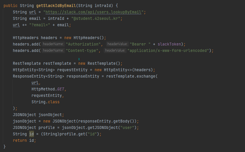 해당 URL로 Slack서버에 토큰과 함께 필요한 정보를 넘기면, body에 user에 대한 정보를 얻어올 수 있다.