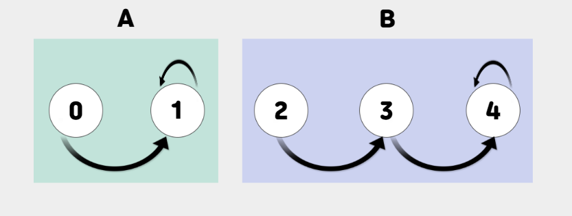 필자는 편의상 집합을 A와 B로 라벨링 했지만, 한 원소가 속한 집합이 어떤 집합인지 코드로 표현하는 방법은 다르다. 코드에서는 자신이 속한 집합의 대표로 집합을 구분하고, 그 대표를 통상적으로 '부모'라고 한다.