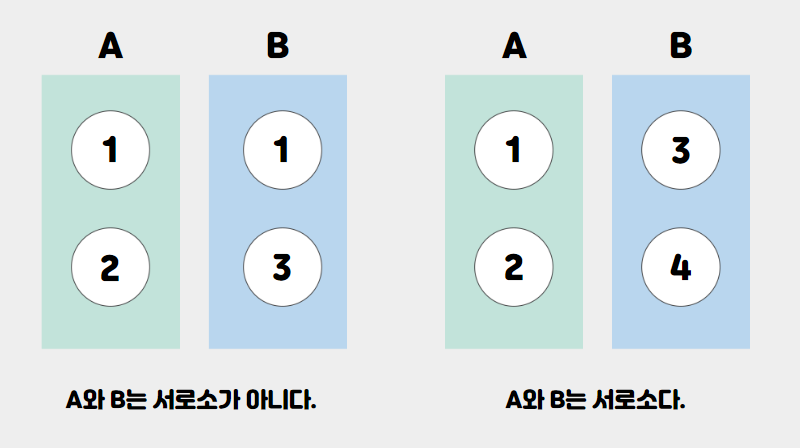 서로소(disjoint)는 공통으로 포함하는 원소가 없는 두 집합의 관계다.