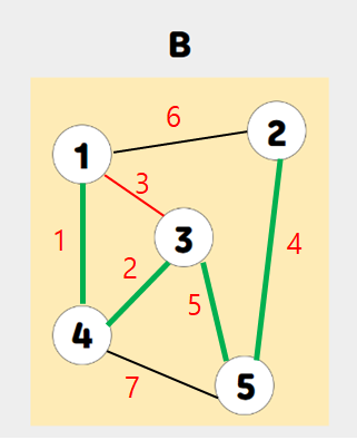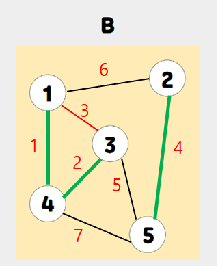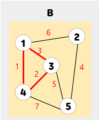 B : 간선은 4개지만, 간선끼리의 가중치 값이 8 + 5 + 4 + 3 + 2 = 22이므로 최소 신장트리가 아닌 신장트리의 일부다.