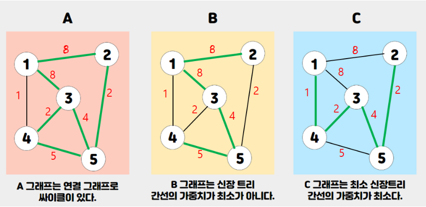 - 연결한 간선의 가중치 합이 가장 최소가 되는 그래프