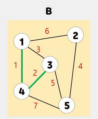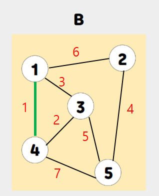 먼저, 가장 가중치가 작은 간선 (1, 4)을 선택한다.