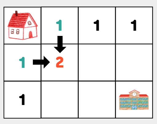 (0, 1)을 기준으로, 해당 칸에 올 수 있는 방법은 왼쪽(집)에서 오는 방향 뿐이다. 위에서는 올 수 없다.