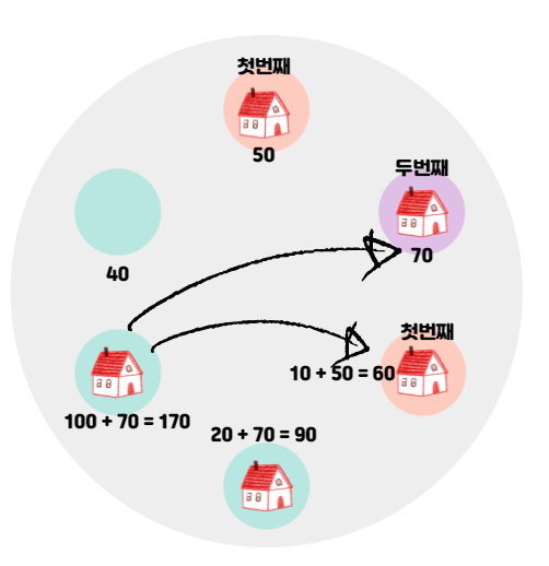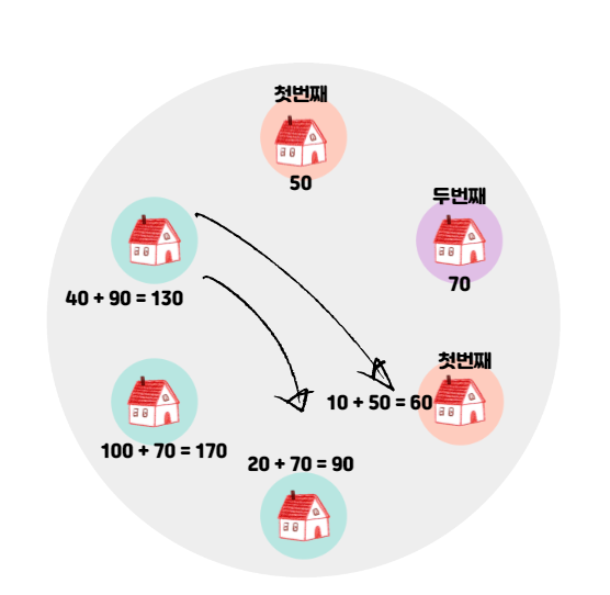 따라서 세 번째 집의 경우, 자신의 금액 10원과 첫 번째 집을 턴 50원을 합쳐 60원이 들어있게 된다.