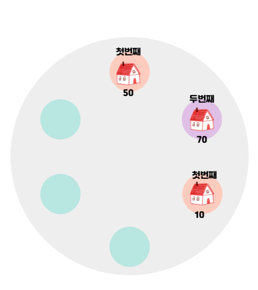 도둑이 어느 마을을 털 계획을 하고 있습니다. 이 마을의 모든 집들은 아래 그림과 같이 동그랗게 배치되어 있습니다. 각 집들은 서로 인접한 집들과 방범장치가 연결되어 있기 때문에 인접한
