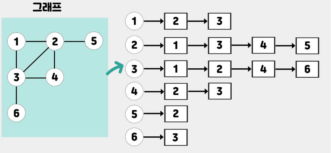 인접 리스트를 통해 주어진 그래프를 그림과 같이 구현한다.