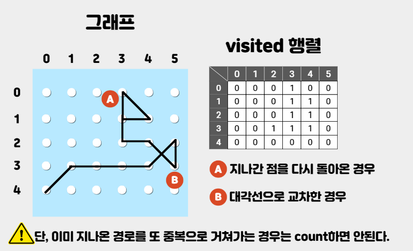 단, 지나간 경로를 또 지나가는 중복된 상황은 count하면 안된다.