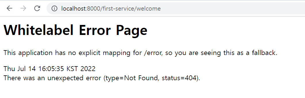 http://localhost:8081/welcome 으로 받는다고 설정해놨는데, http://localhost:8081/first-service/welcome 으로 보내니 당연히 404(해당 경로에 대한 페이지나 응답이 없음)오류가 뜨는 것이다.