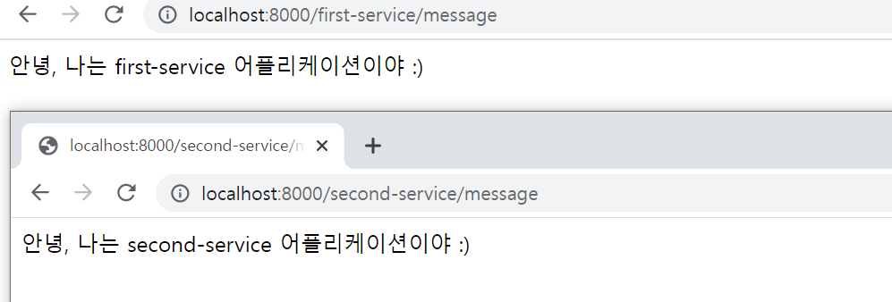 포트번호 8000번 sevice에서 해당 url로 요청했을 때, 각 8001, 8002에 있는 service 내 컨트롤러까지 요청이 잘 전달된 것을 볼 수 있다! 야호!