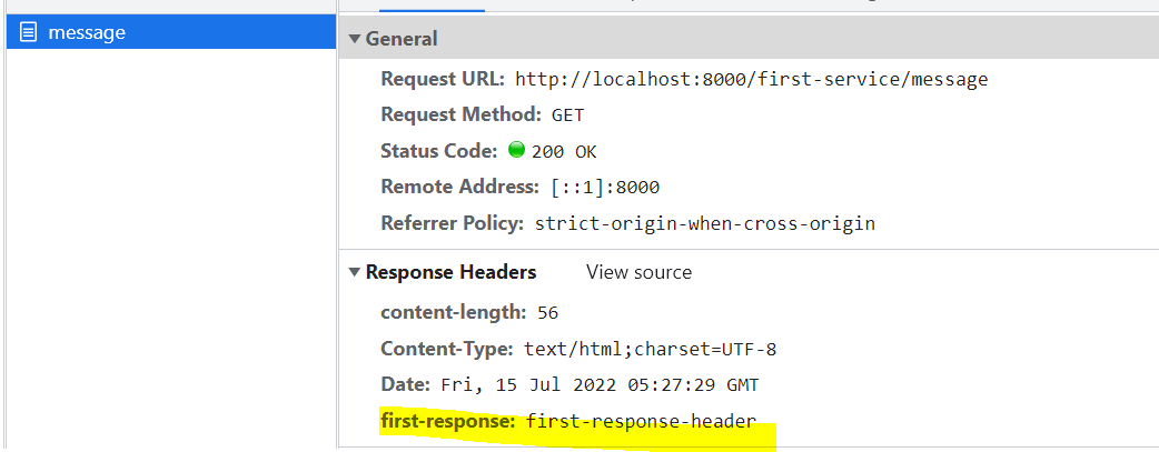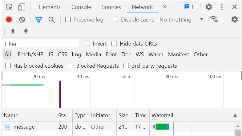 개발자 도구의 Network탭을 누른 후 새로고침하자. 그럼 우리가 요청한 message에 대한 정보가 뜬다! 클릭해보자.