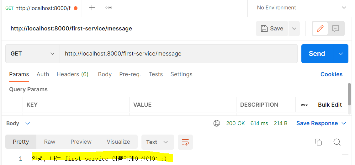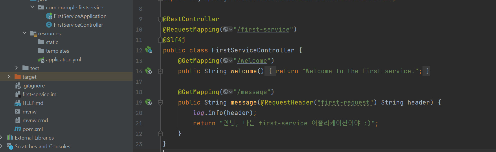 그 후, first-service 프로젝트로 이동하여 controller에 메소드를 새로 추가해주자.