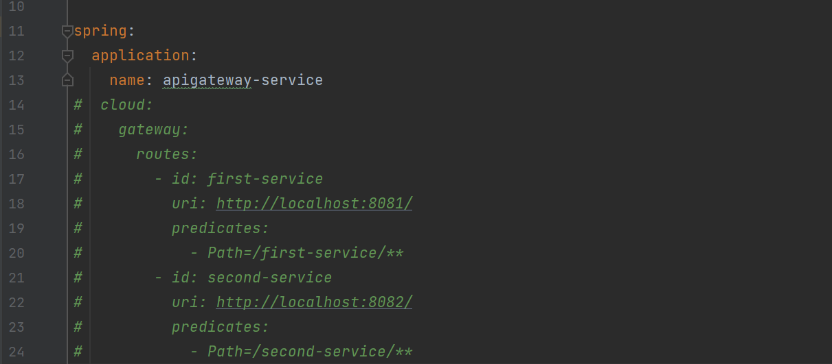 이제 apigatewayservice 프로젝트의 설정파일에서 이전에 만들었던 yml 설정파일을 주석처리한다.