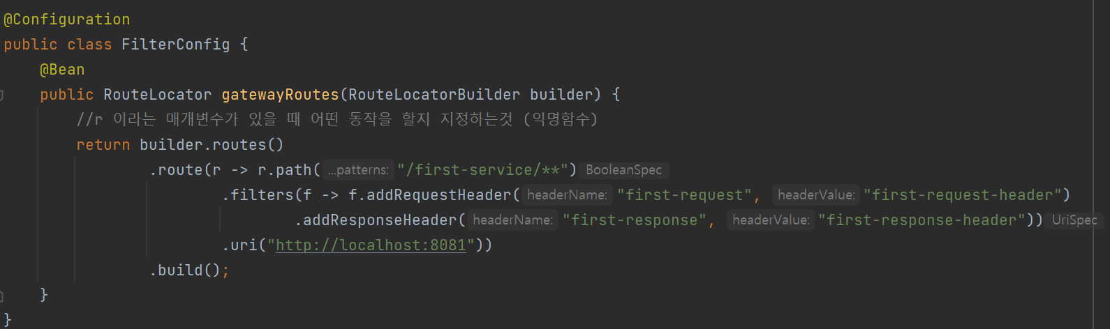 - .route -> 라우터를 등록한다. 패턴은 "first-service/" 경로로 들어오는 모든 것