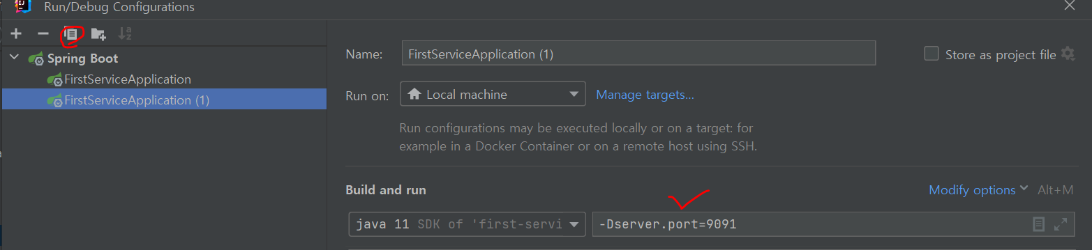 해당 버튼을 눌러 어플리케이션을 똑같이 복사한 후, VM 설정에 -Dserver.port=[포트번호] 를 입력해서 서버 수를 증설하자!