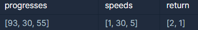 프로그래머스 팀에서는 기능 개선 작업을 수행 중입니다. 각 기능은 진도가 100%일 때 서비스에 반영할 수 있습니다. 또, 각 기능의 개발속도는 모두 다르기 때문에 뒤에 있는 기능이 앞에 있는
