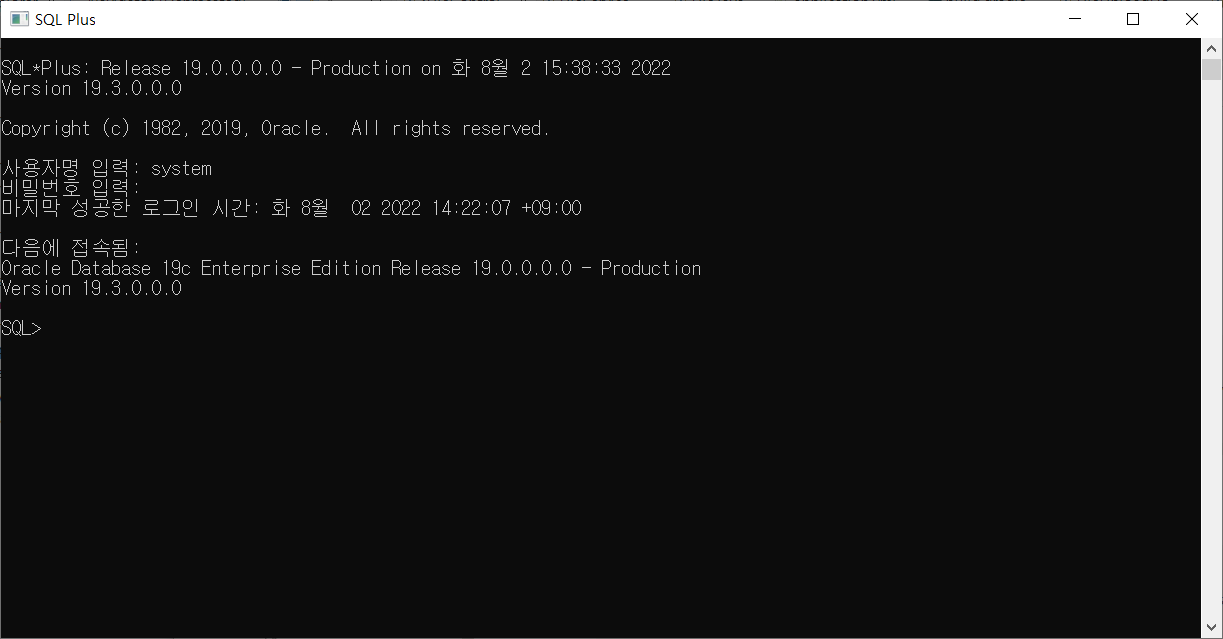 먼저 SQL Plus 창을 띄워보자. cmd에서 sqlplus를 입력해도 상관없다.